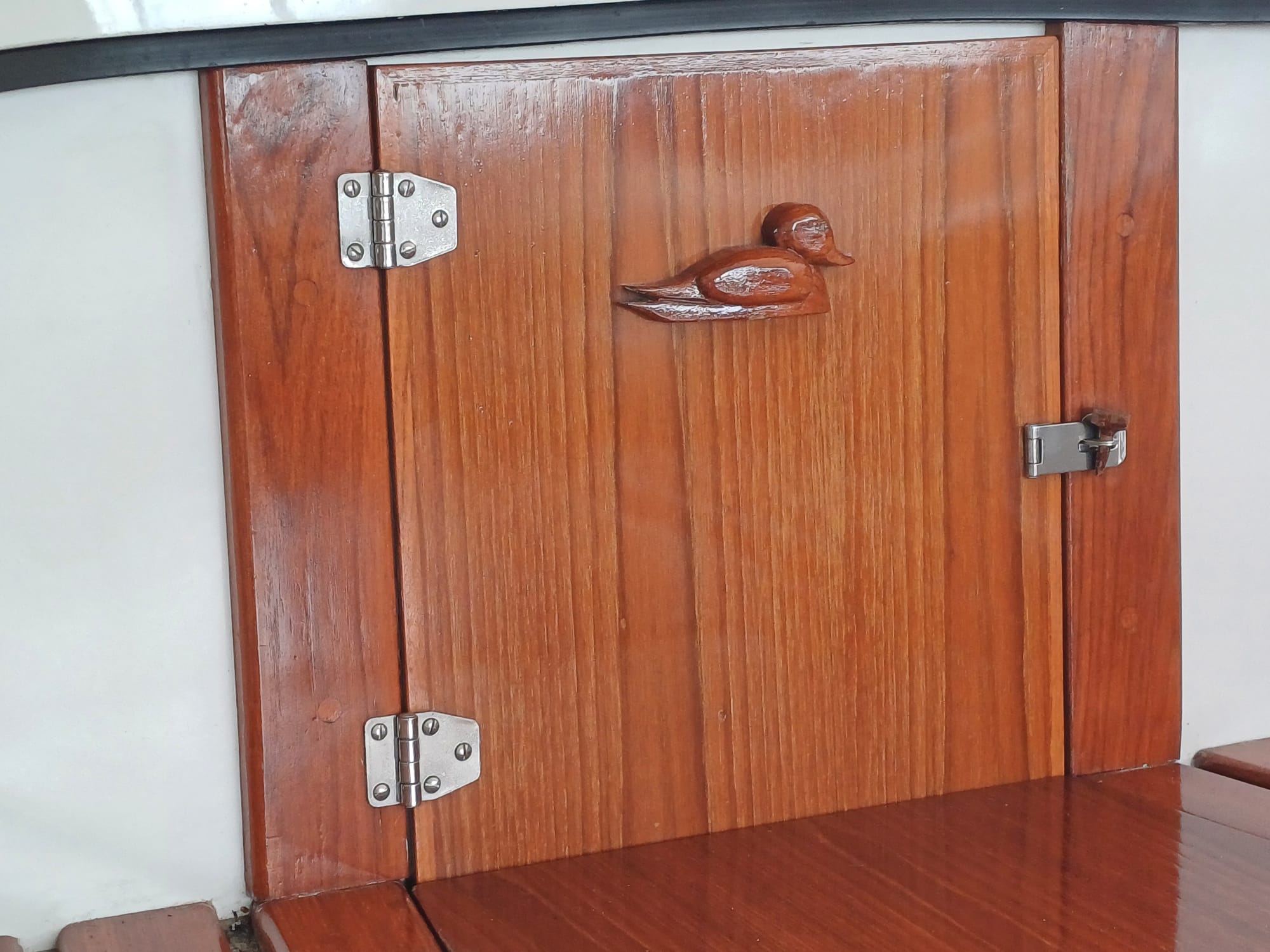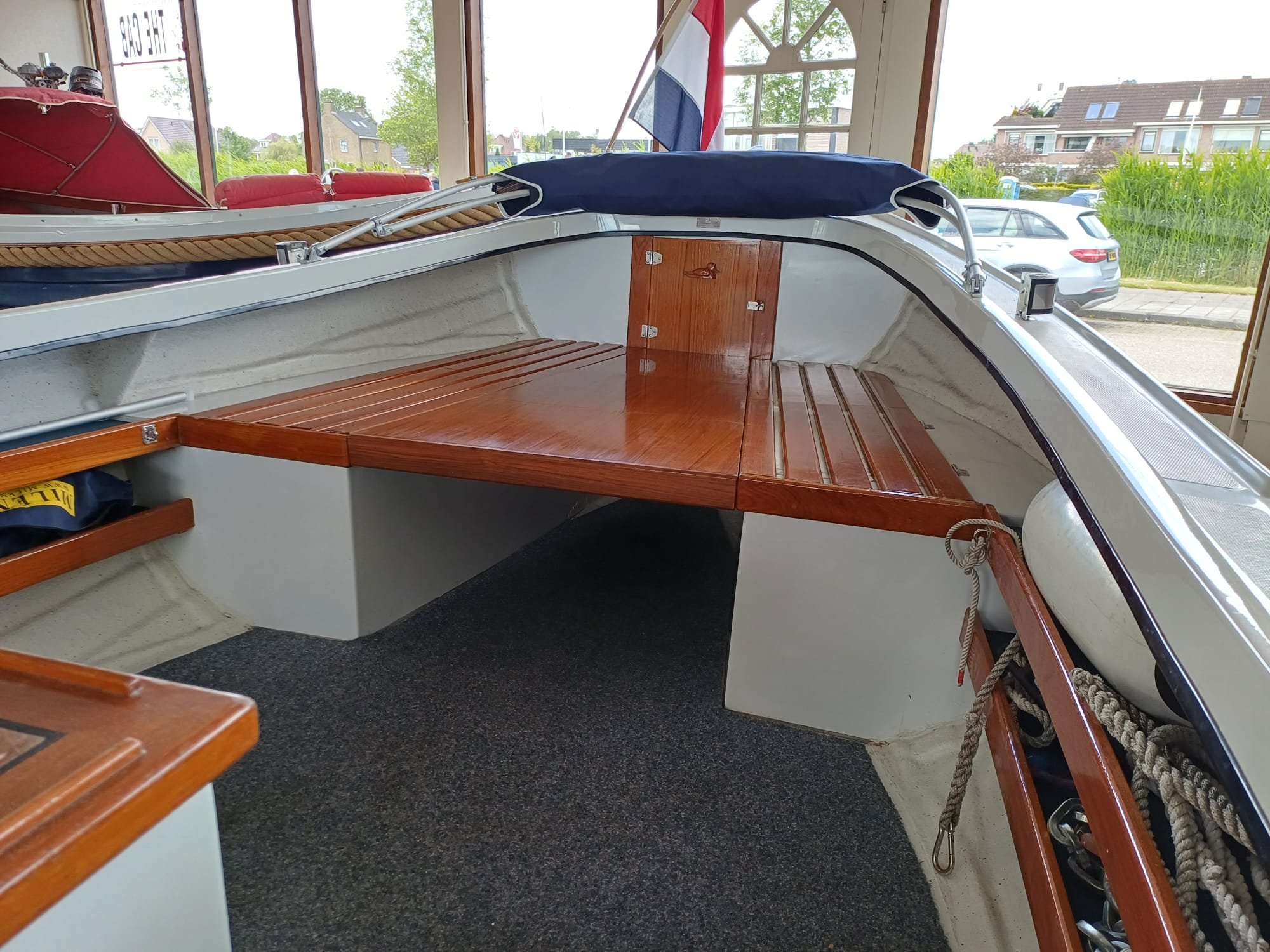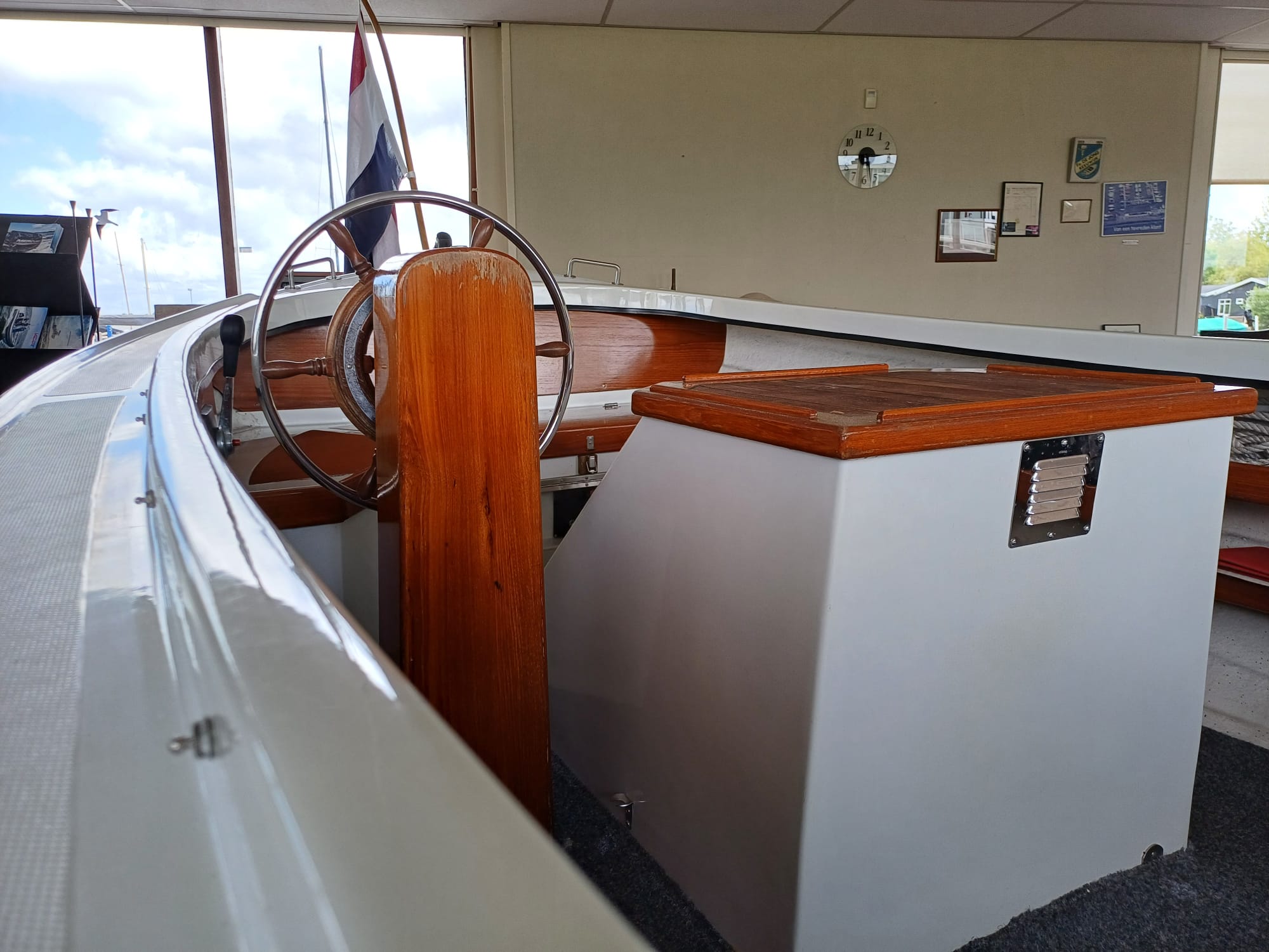 Buiskap met aanritsbaar achterzeil, stuurkolom, houten tafelblad op motorkast, zonnedek nivometer en urenteller.