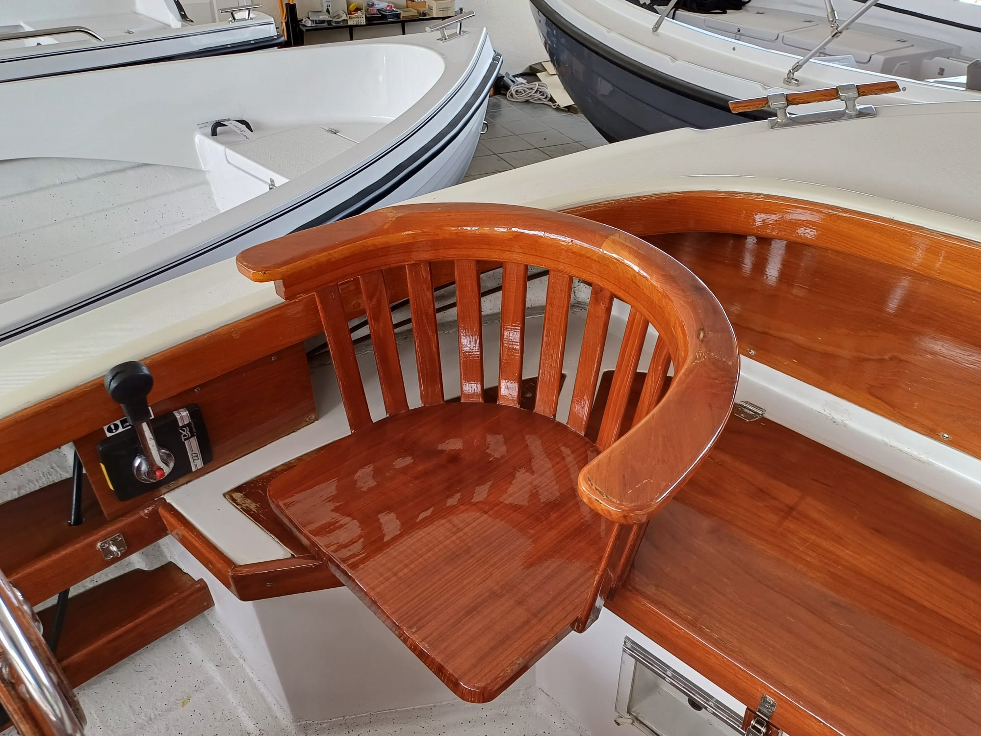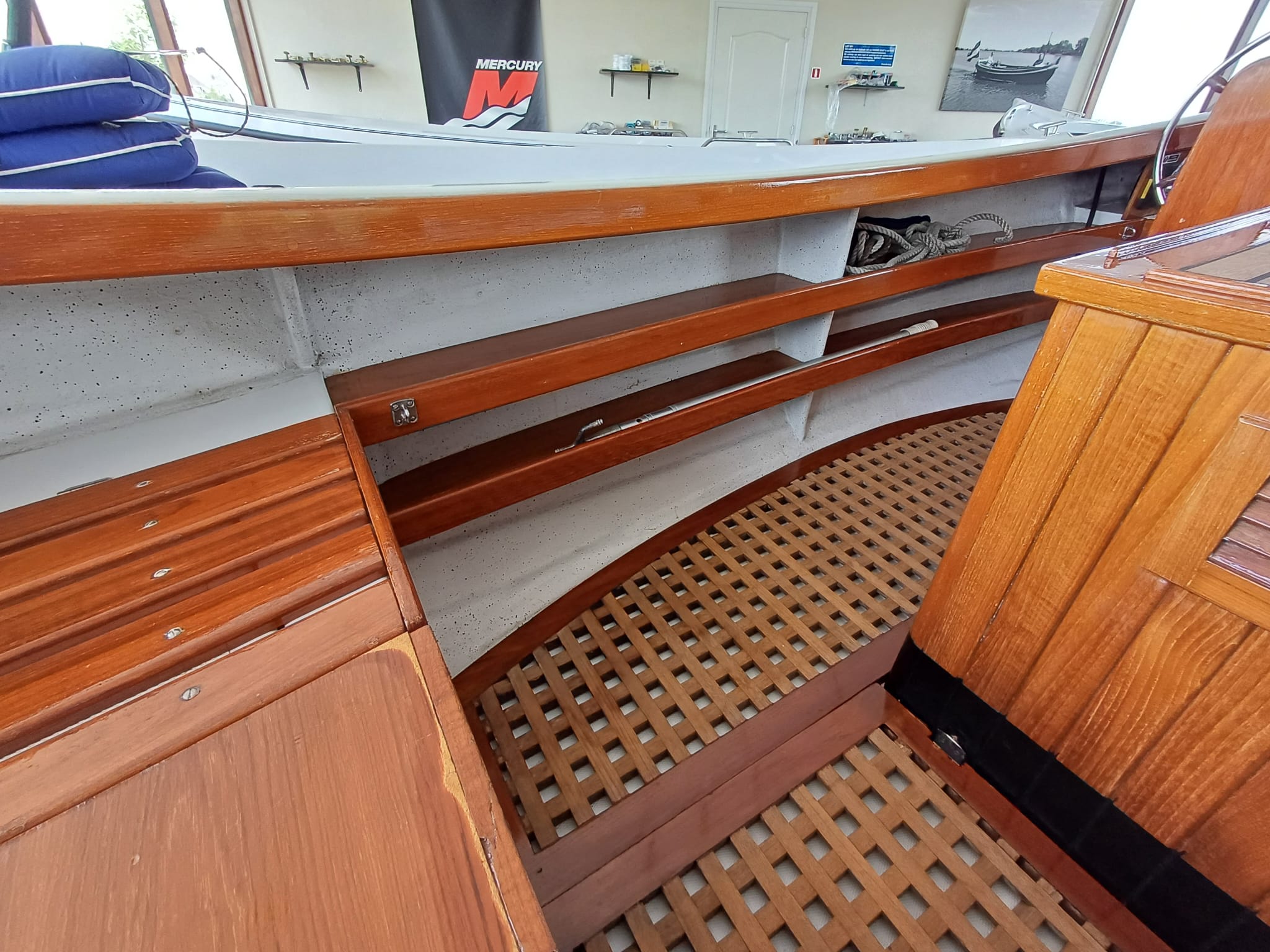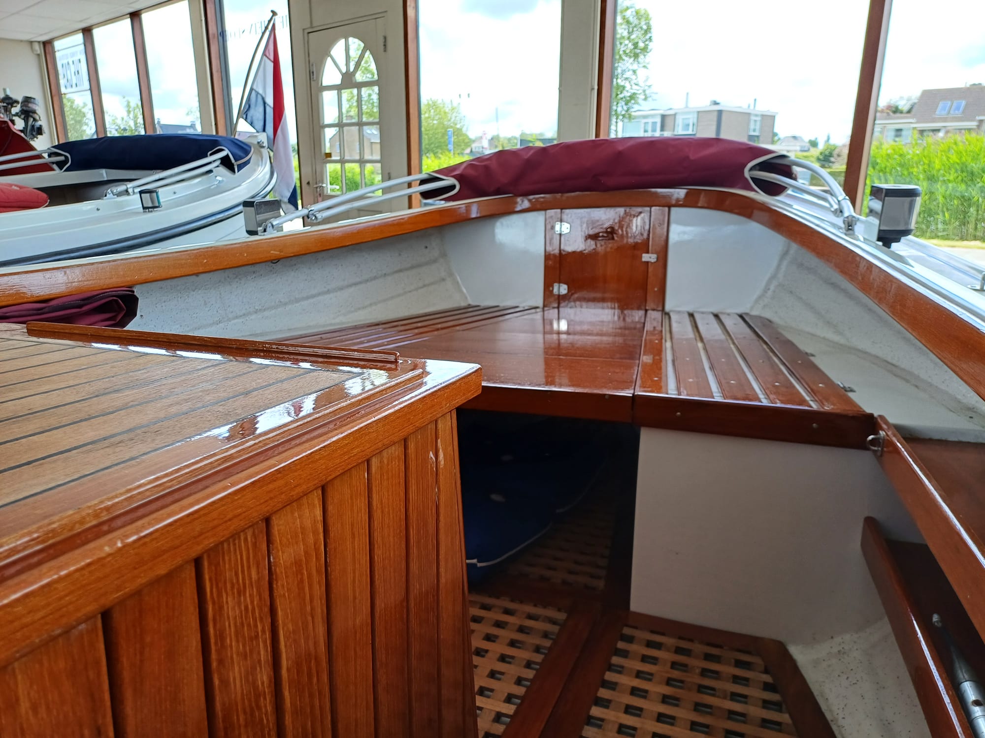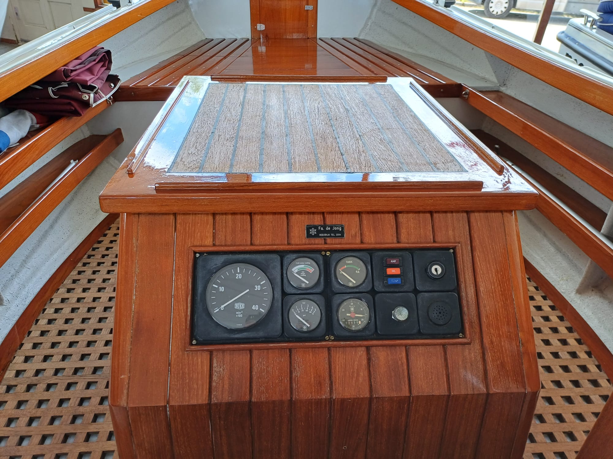 Buiskap met aanritsbaar achterzeil, stuurkolom, houten motorkast, houten kuiplijsten, teakvloer, kabelaring, nivometer, urenteller, oliedrukmeter, temperatuurmeter, toerenteller en plateau met zwemtrap.
