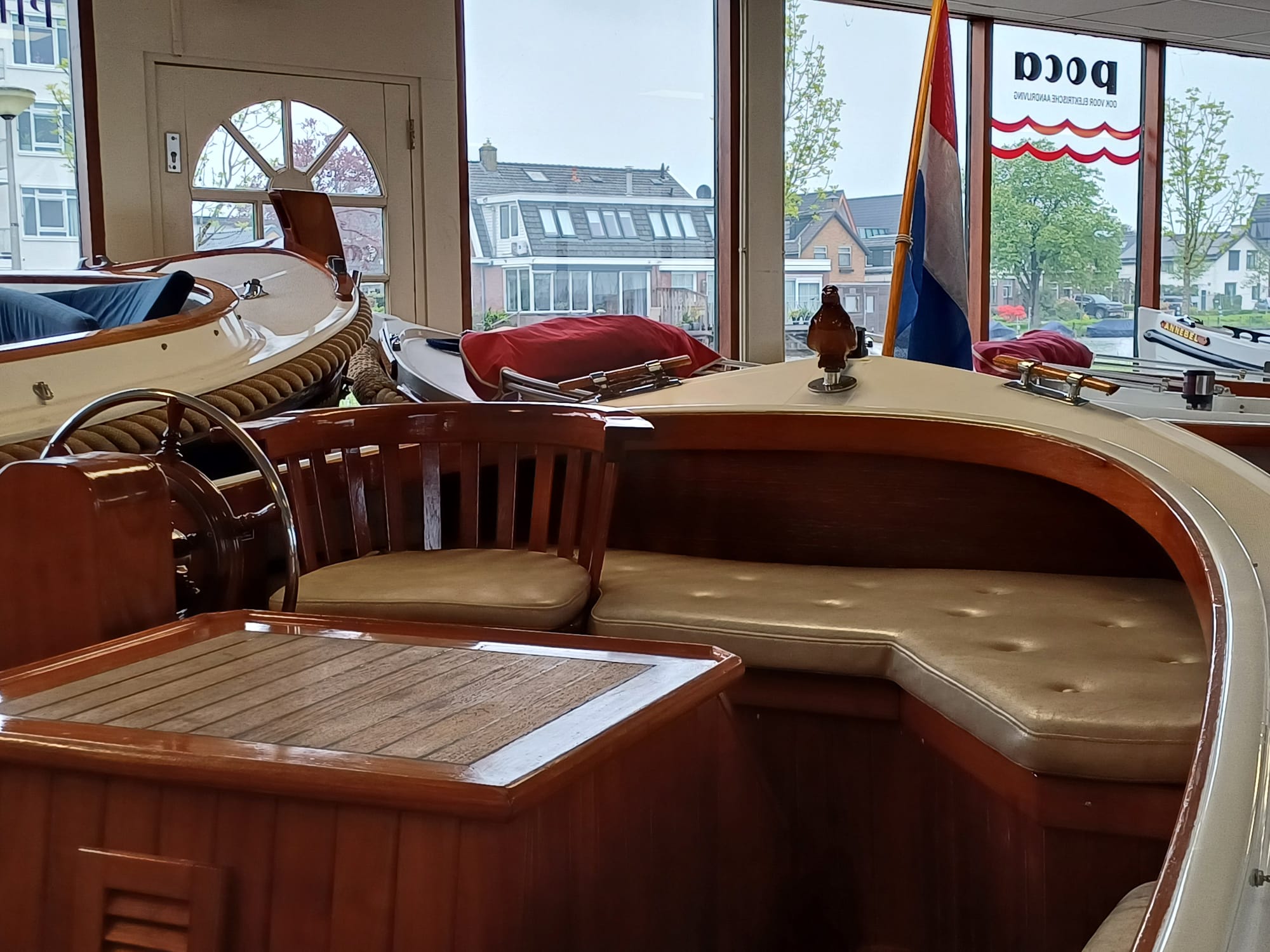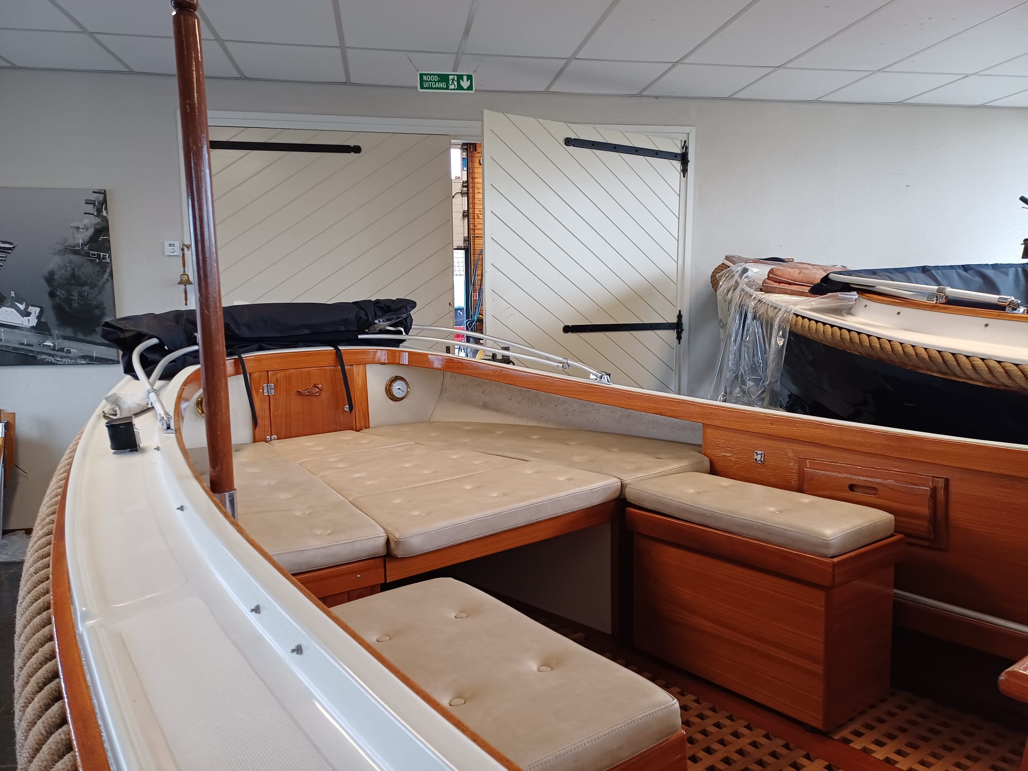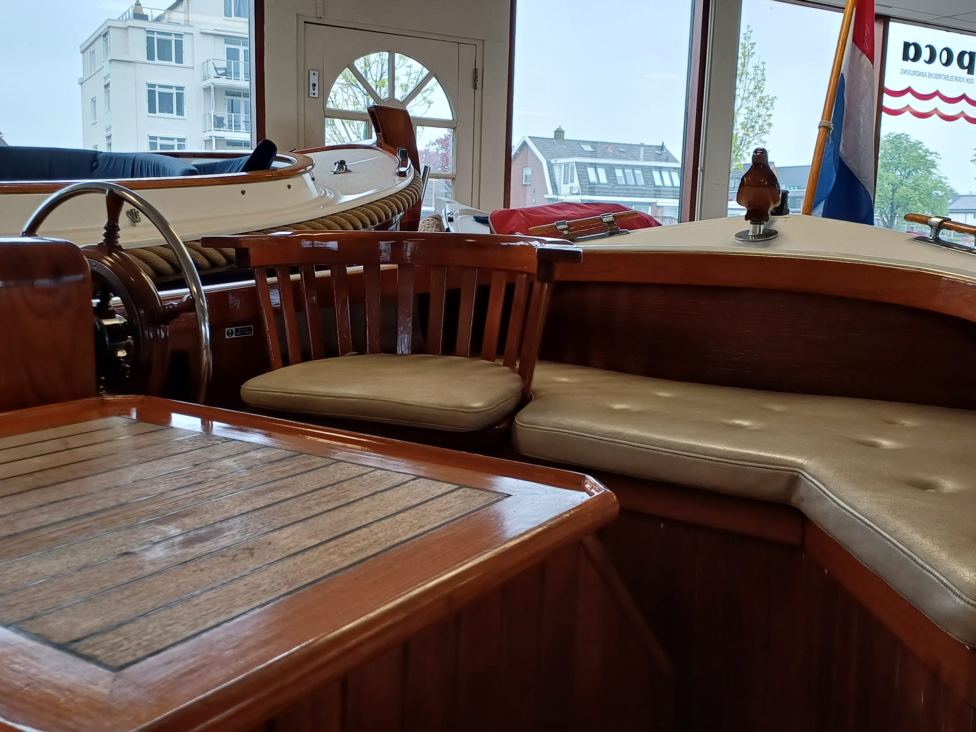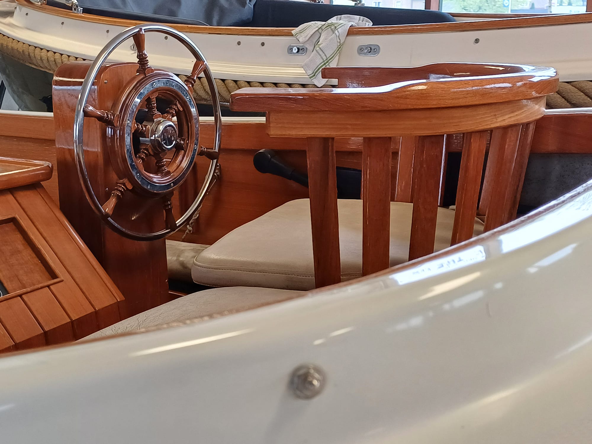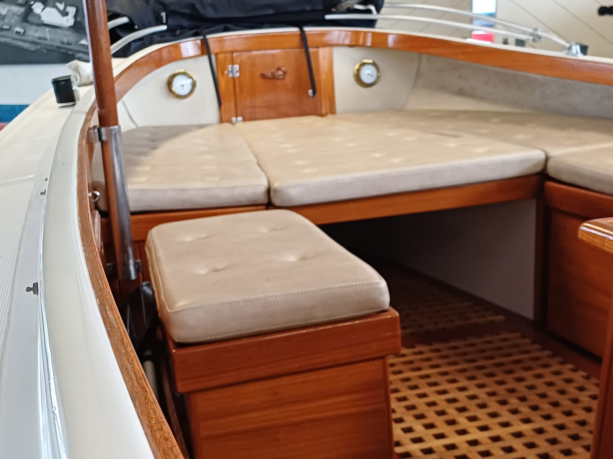 Buiskap met aanritsbaar achterzeil, houten stuurkolom, motorkast, stuurstoel en instapstok, houten kuiplijsten, kabelaring, teakvloer, zonnedek met kussenset, temperatuurmeter, navigatie verlichting en zwemtrap.