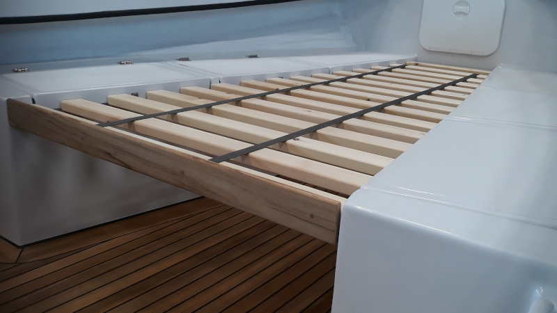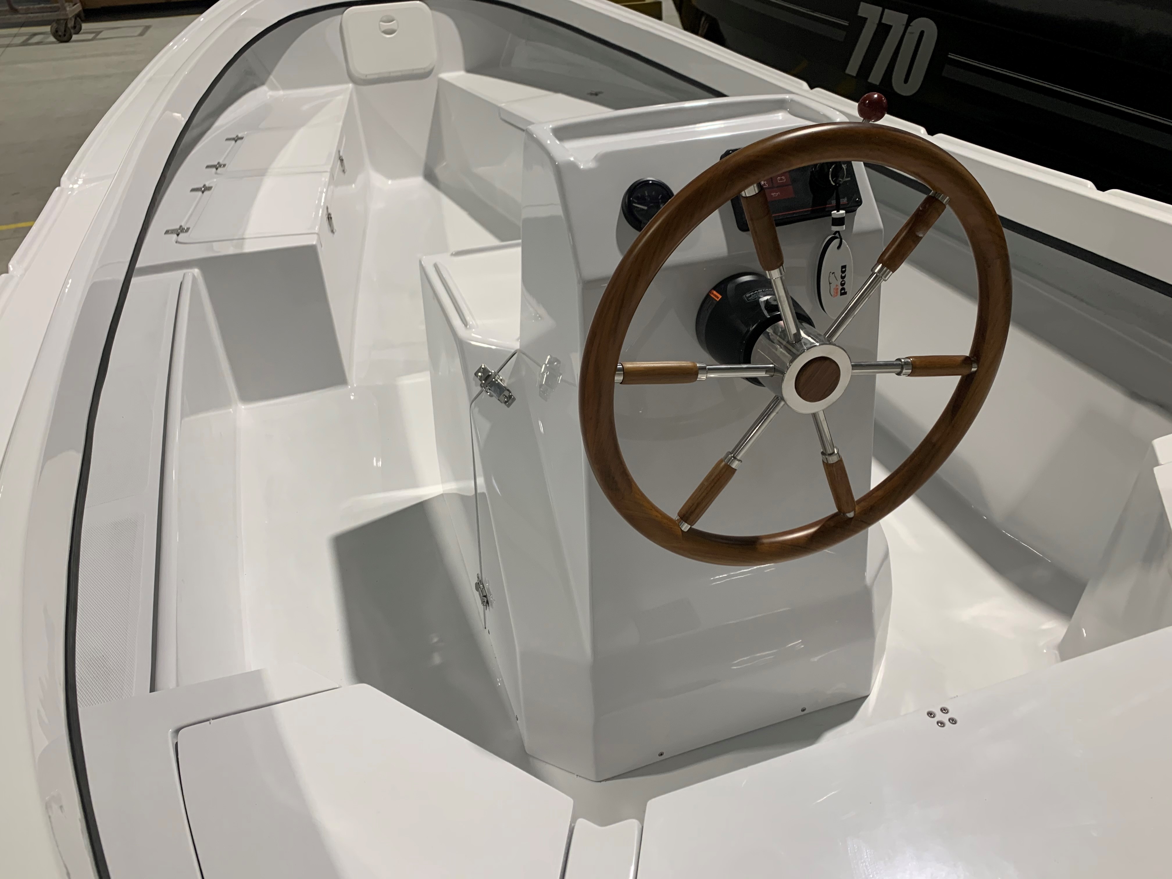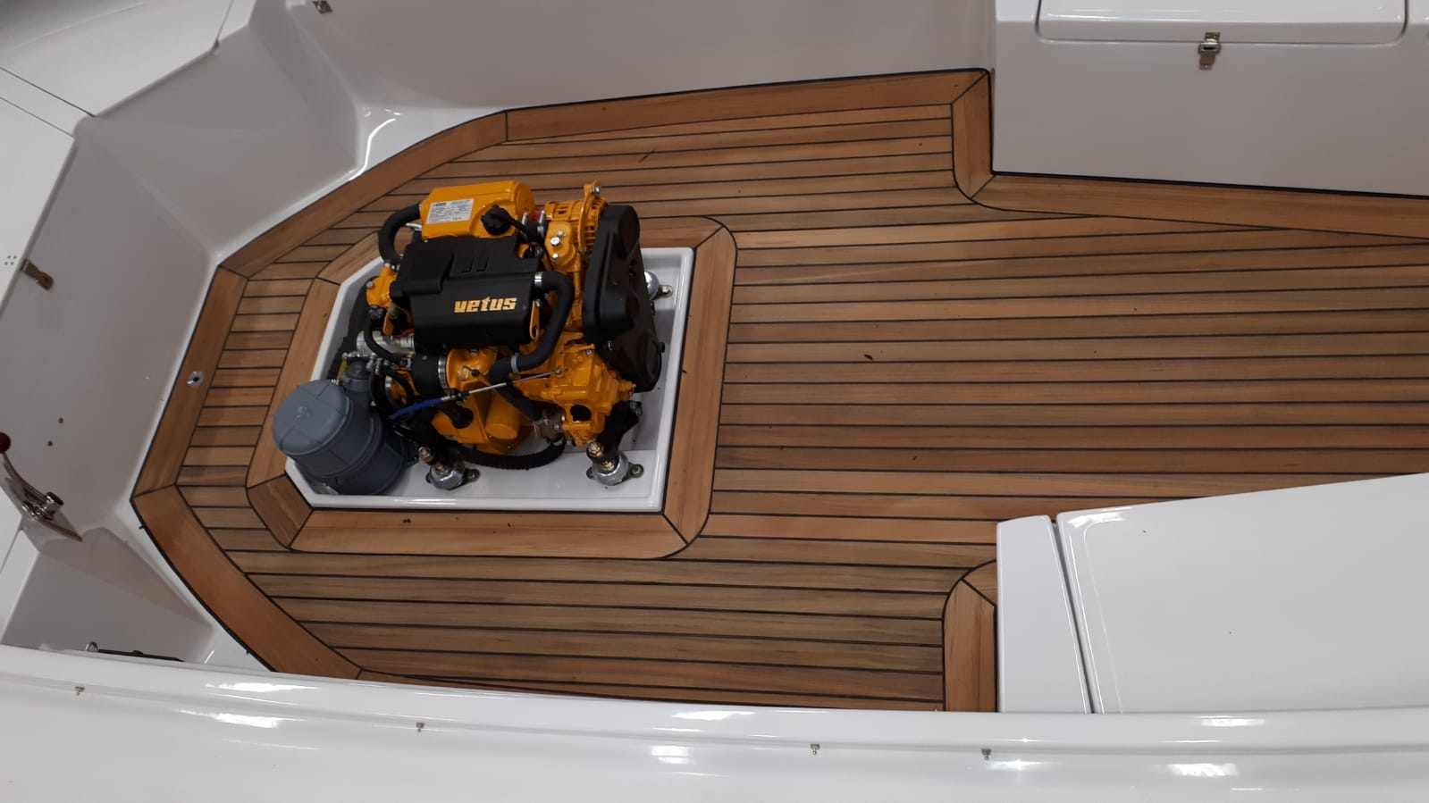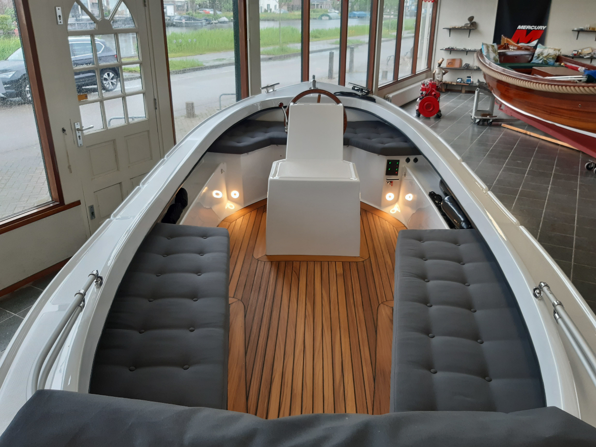 Teak- of kunststof vloer, buiskap met achterzeil, zonnedek, luxe instrumentenpaneel, geluidsisolatie van de motorkast, accessoires-pakket bestaande uit: navigatieverlichting, binnenverlichting, schakelpaneel, niveau- meter, 12 volt en usb aansluiting en kussensets voor op de voor-, achterbanken en zonnedek.